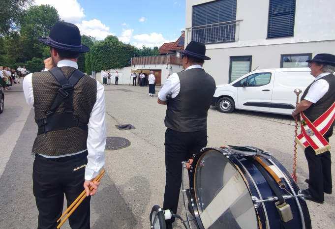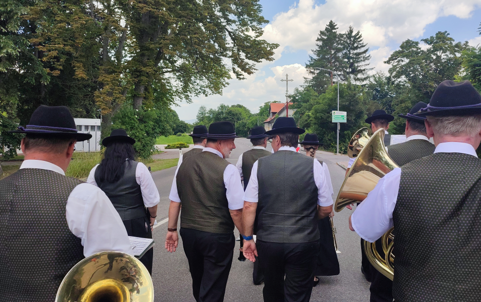 Statt „links“ sind wir eben „rechts“ nach der Brücke abgebogen und folgten einem anderen Pfad mit leicht geänderten Stationen. In Abwechslung mit dem Kirchenchor waren wir für die prozessuale Musik zuständig – nebenbei begleitete uns hochsommerliches Wetter.